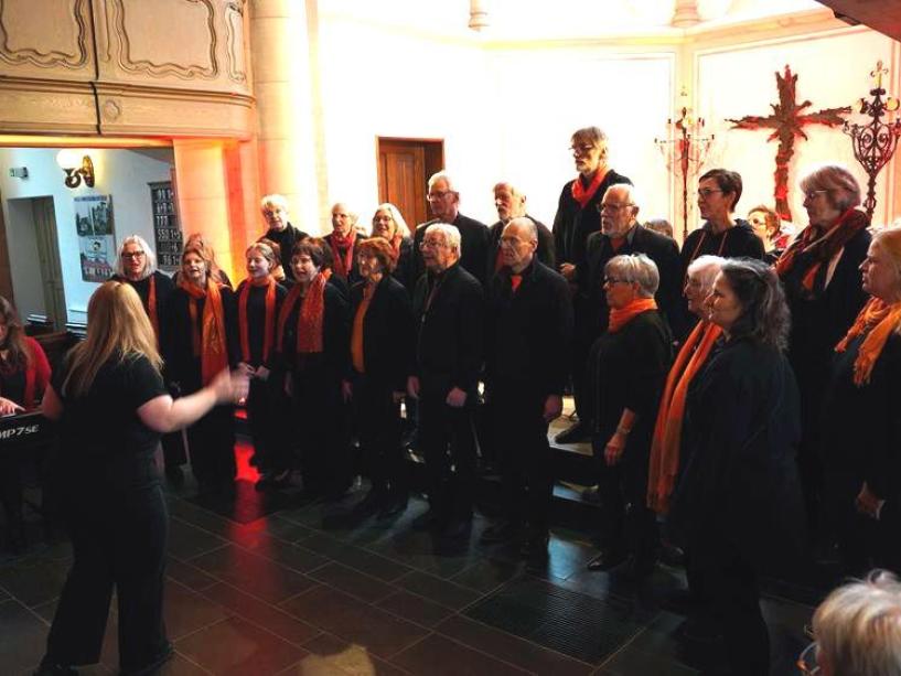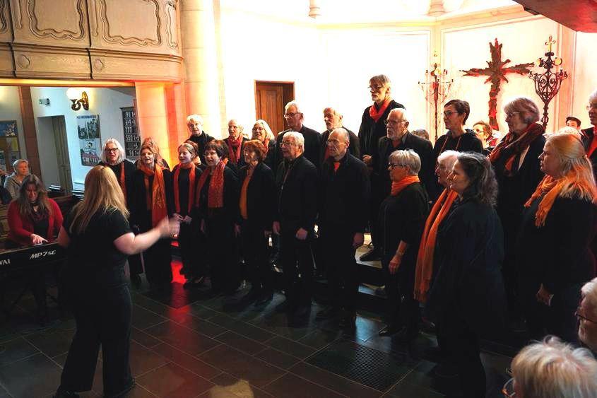 Eine sehr agile Formation, die alte und neue Gospels präsentiert und inzwischen auch durch jazzige Stücke ergänzt wird. Davon gaben Kunde z. B. Kompositionen „Come let uns sing“, „Musik nur, wenn sie laut ist“ oder „I will always sing to you“, um nur einige von den Zuhörerinnen und Zuhörern gefeierten Stücke zu nennen. Als Zugabe brachte der Chor noch das in beschwingtem Stil vorgetragene Stück „Easy on me“ zu Gehör.