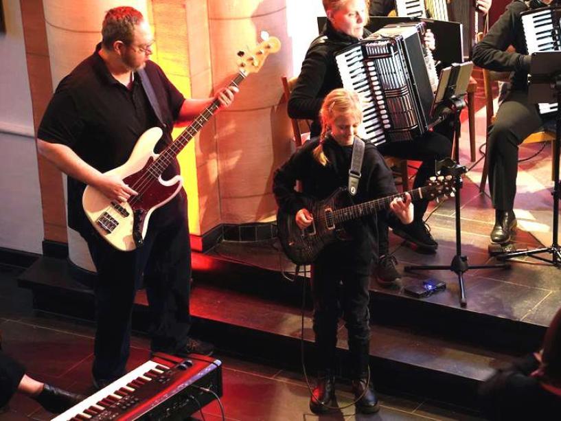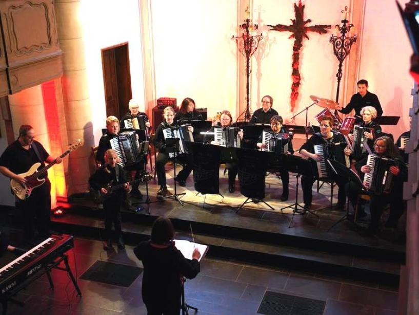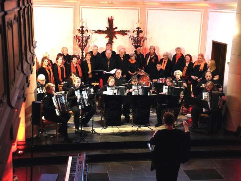 an Expressivität zutage trat. Vor allem wurde erkennbar, dass das Akkordeon keineswegs nur auf die Darbietungen von Polkas oder Walzer beschränkt ist. Die präzise arbeitenden Ventilklappen und die Dosierung der Luftmenge im Balg lassen jeden nur denkbaren Rhythmus zu. Dies konnte das Orchester – im ersten Teil unter der hervorragenden Leitung und Leistung von Kerstin Hoffert - dem erstaunten Publikum eindrucksvoll darstellen. Danach gab es akustische Abwechslung mit den Vorträgen von „Gospeltrain“.